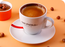 O irresistível espresso San Paolo, servido em uma xícara recheada com Avelã ou creme de pistache.